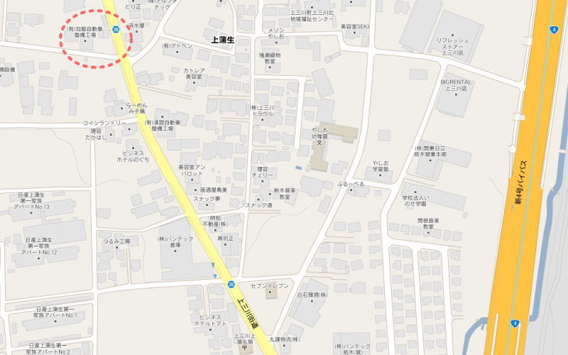 (左上の赤い点線のところが弊社車検工場です)